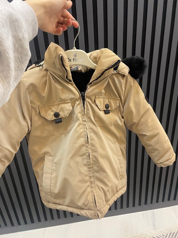 Bej renkli, kürklü detaylara sahip erkek çocuk montu. Notch yaka, regular fit ve yumuşak, sıcak kumaş kullanılmış. Kapüşonlu ve cepli, street wear tarzında.