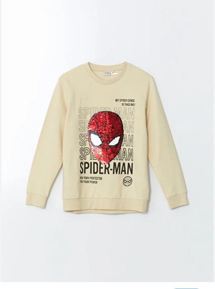 Bej renkli, uzun kollu ve bisiklet yaka olan erkek çocuk sweatshirtü, sentetik kumaştan üretilmiş ve önünde Spider-Man baskısı bulunuyor. ️