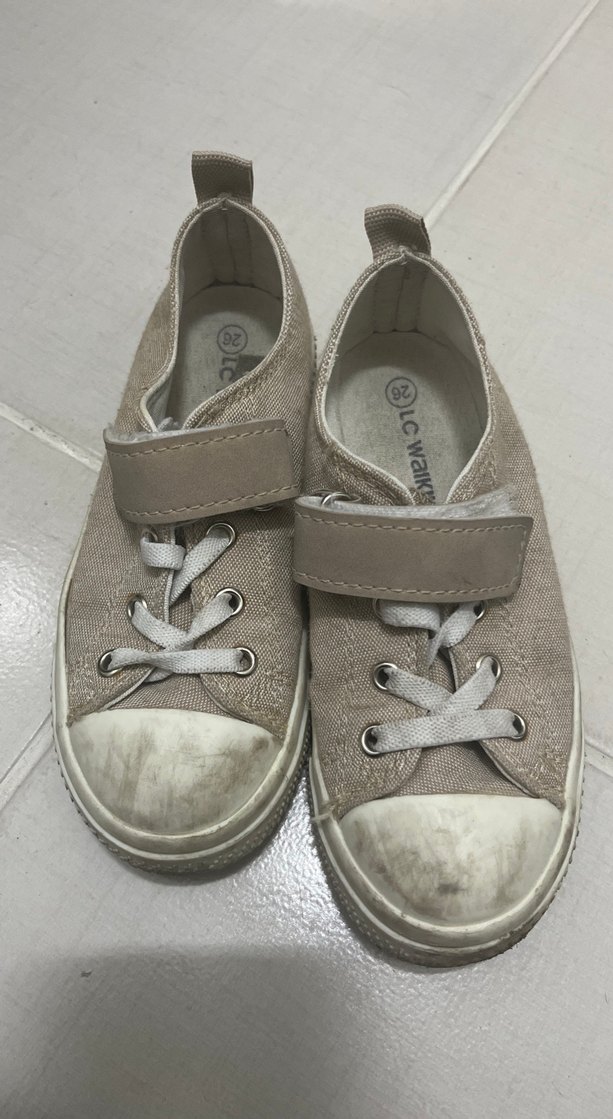Bej renkli, cırtcırtlı erkek çocuk spor ayakkabısı. Gri tonlarında, desen içermeyen normcore tarzında, kauçuk tabanlı.
