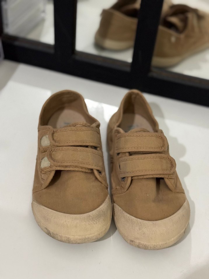 Bej renkli, cırt cırtlı ve kauçuk tabanlı erkek çocuk spor ayakkabısı, sade ve pastel tarzda sokak giyimi için uygundur.
