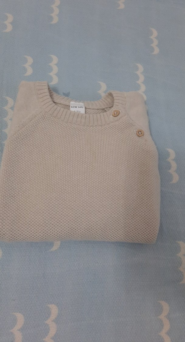 Bej renkli, yuvarlak yaka, uzun kollu erkek çocuk triko kazak. Rahat kesim ve omuzda düğme detayı bulunur.