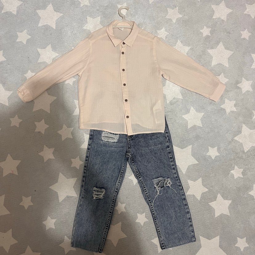 Bej Erkek Çocuk Uzun Kollu Gömlek ve kot pantolon