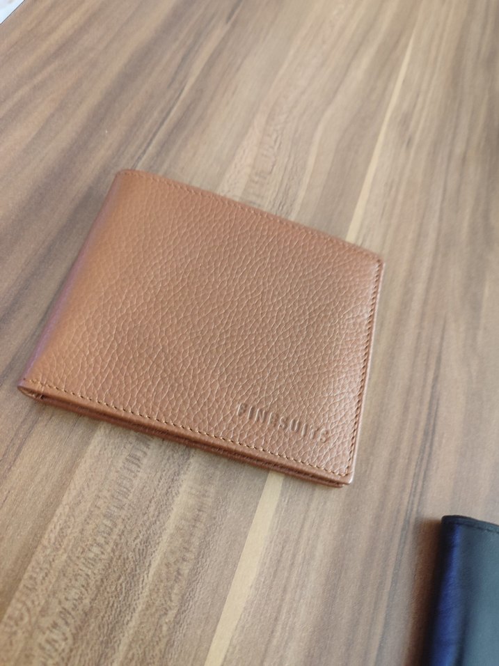 Bej renkli, parlak yüzeye sahip erkek cüzdanı. Minimalist ve çağdaş tasarımıyla sade ve desensizdir.