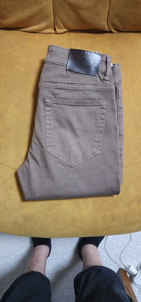 Bej renkte, düz desenli erkek denim pantolon. Normal boy ve rahat kesimle günlük sokak stiline uygun, zahmetsiz şıklık sunar.