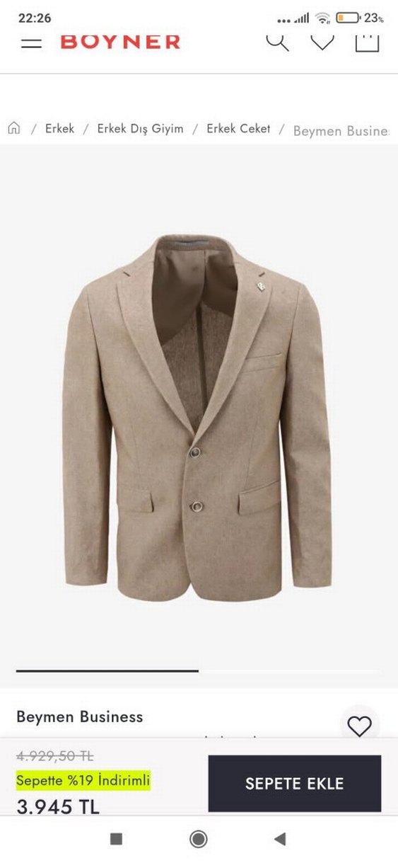 Bej renkli, düğmeli, klasik modern tarzda erkek ceket. Notch yakalı, normal kesim ve uzun kolludur, ofis kullanımı için uygundur. Beymen marka