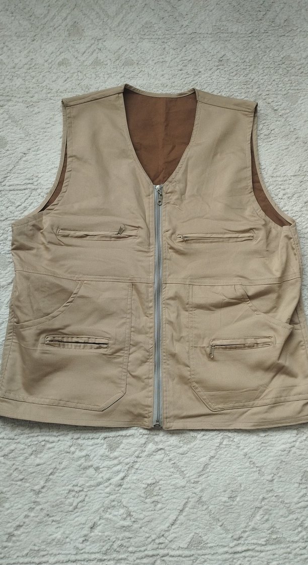 Bej renkli, fermuarlı, kolsuz yelek. Rahat kesim ve çoklu fermuarlı ceplere sahip. Pürüzsüz sentetik kumaştan, günlük sokak tarzına uygun.