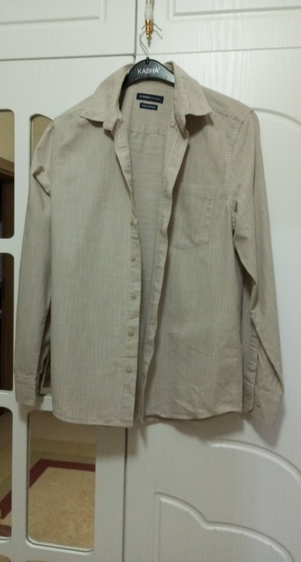 Bej renkte, uzun kollu ve düğmeli erkek gömleği yeni sayılır