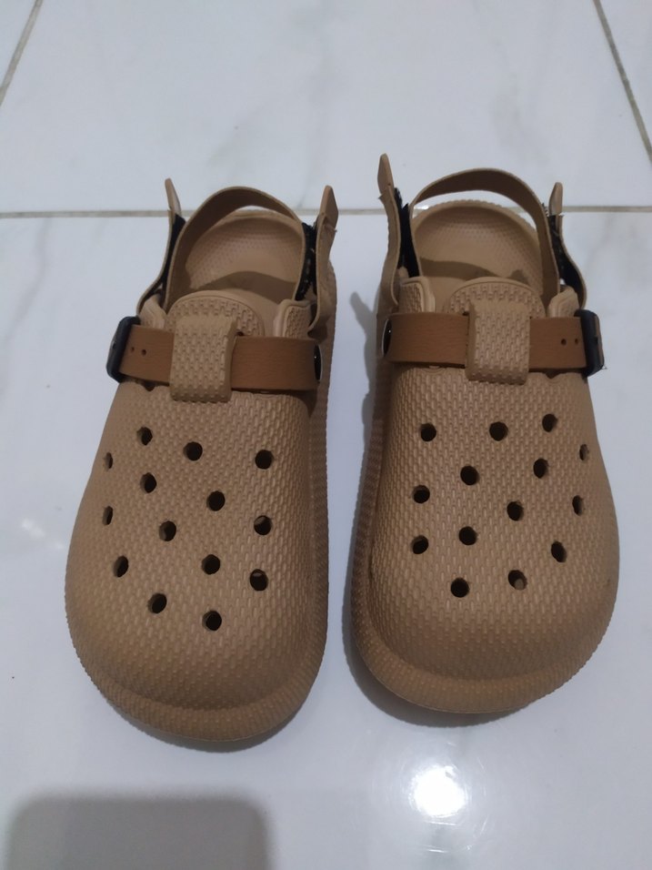 Hafif bej renkte, bantlı ve delikli tasarıma sahip erkek sandalet. Rahat kauçuk malzemeden üretilmiş, günlük sokak stili için uygun. kaliteli malzeme. yumuşak ve rahatlık. arka bağlama lastikli ve cırtlı 32-33 numaradır...
