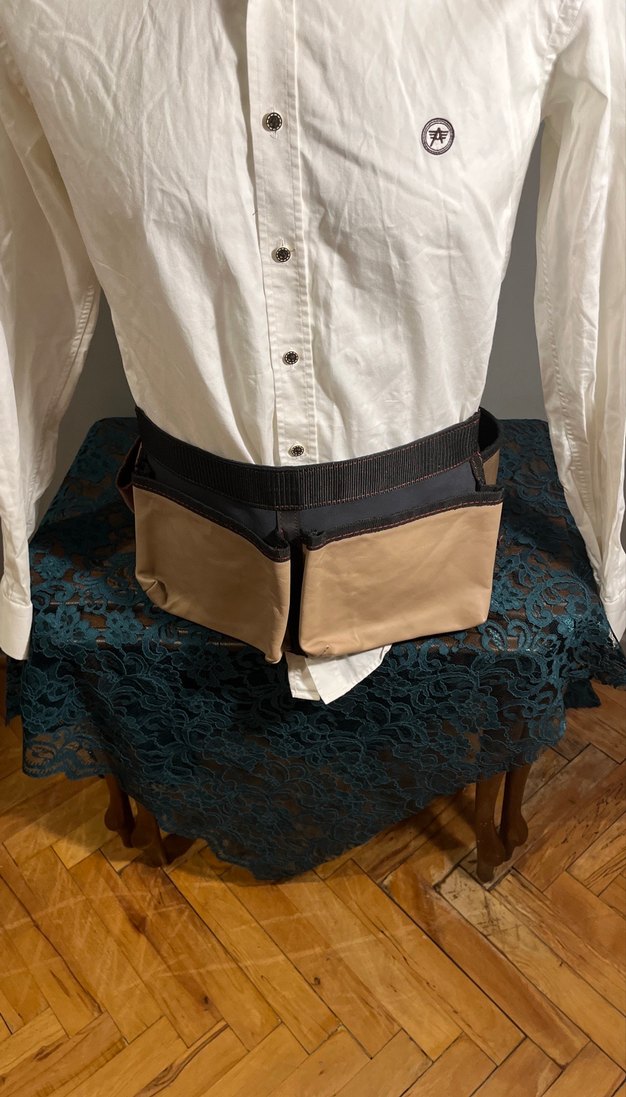 Bej renkte, kemerli ve iki ön cepli -bir yan cep ve bir yan su koyma cepi olan erkek bel çantasıdır. Trendy casual sokak tarzına uygundur.