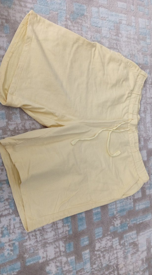 Bej renkli, keten kumaştan, bol kesim ve kısa boyda erkek bermuda şort. Günlük sokak stili için rahat ve sade tasarım.