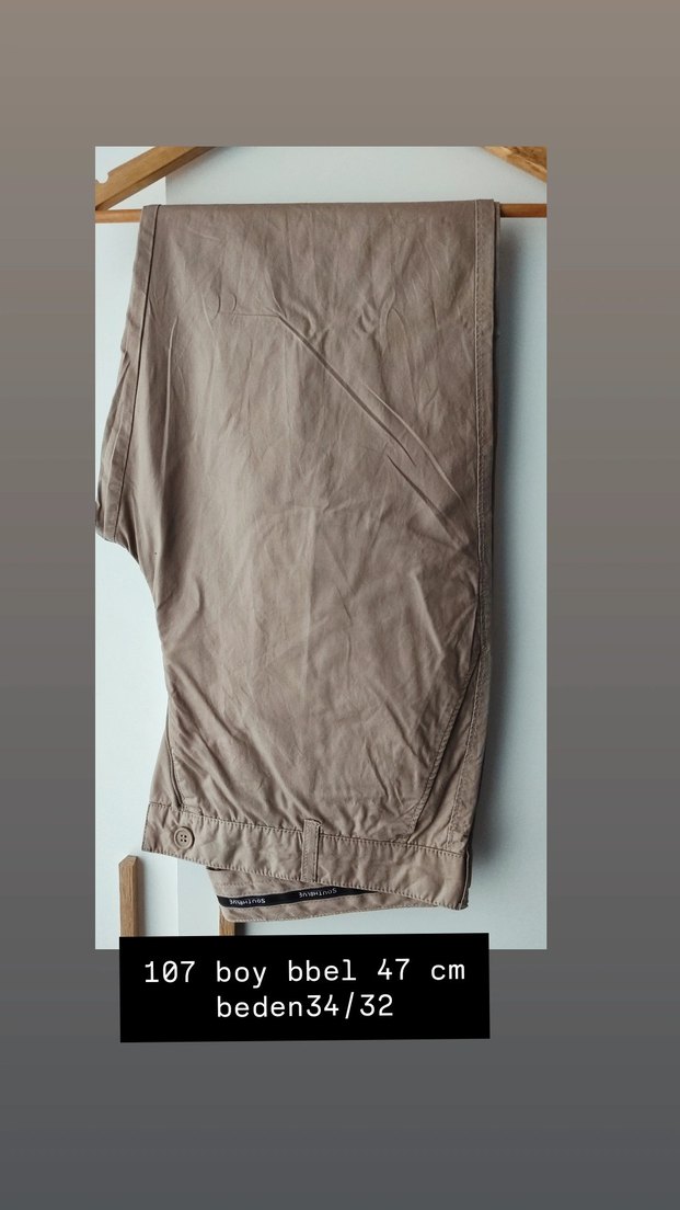 Bej renkli keten kumaştan, bol kesim ve kemerli erkek pantolonu. Günlük rahat kullanıma uygun, beden 34/32, 107 cm boy, 47 cm bel genişliği.