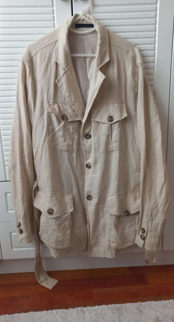Bej keten kumaştan, düğmeli ve cep detaylı, uzun kollu, kesimi bol erkek trenckot.Bohem tarzda, günlük kullanıma uygun. Ürün ölçüleri iki koltuk altı 54 cm boy 83 cm %100 keten. 1 2 kere kullanıldı tertemizdir. italyan markası luppo