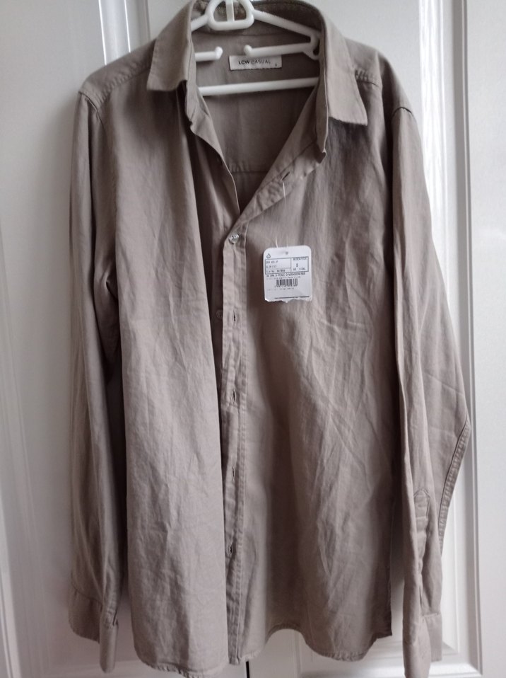 Bej keten erkek gömlek, düğmeli ve uzun kolludur. rahat ve gündelik kullanım için uygundur.