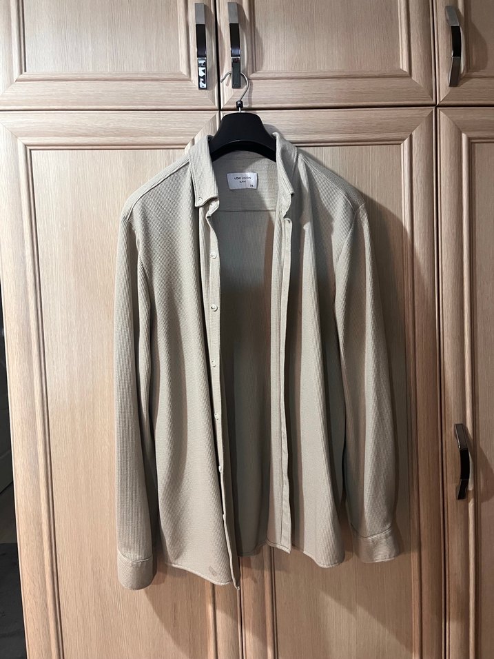Bej renkli erkek keten gömlek, uzun kollu ve düğmeli. Minimalist tasarımıyla ofis ve günlük sokak stiline uygun, normal midi boyda ve regular fit kesimde ve esnek yapıdadır