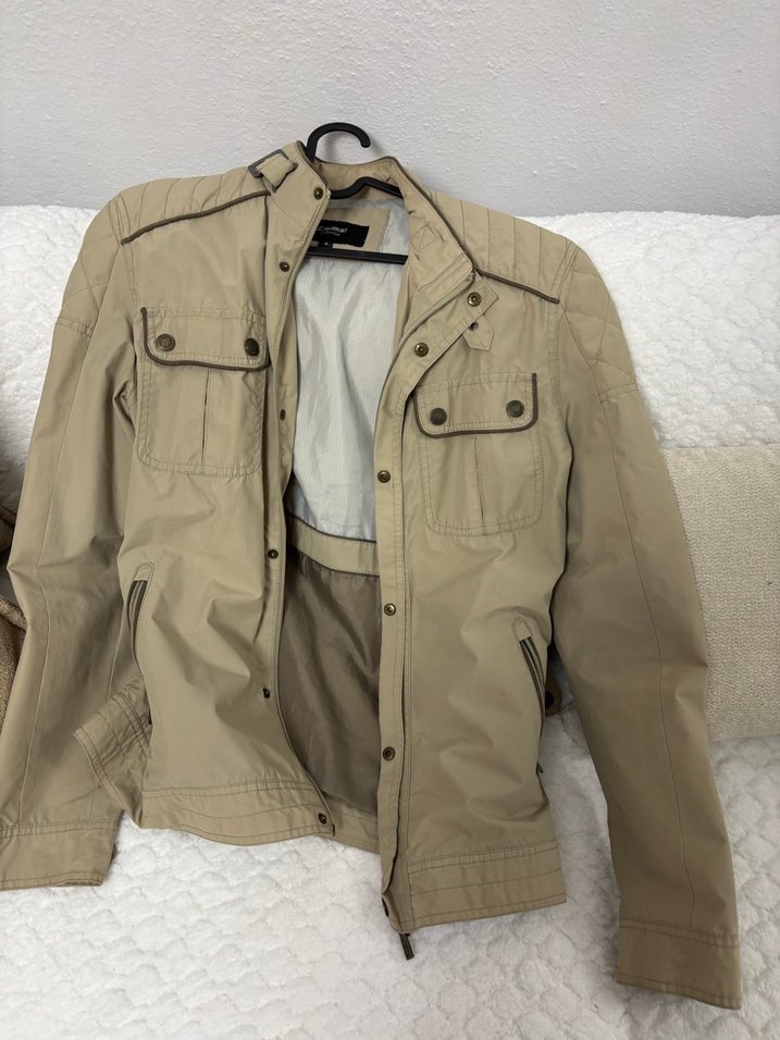 Bej keten kumaştan, kemerli, uzun kollu, normal kesim ve günlük kullanım için uygun erkek ceket.