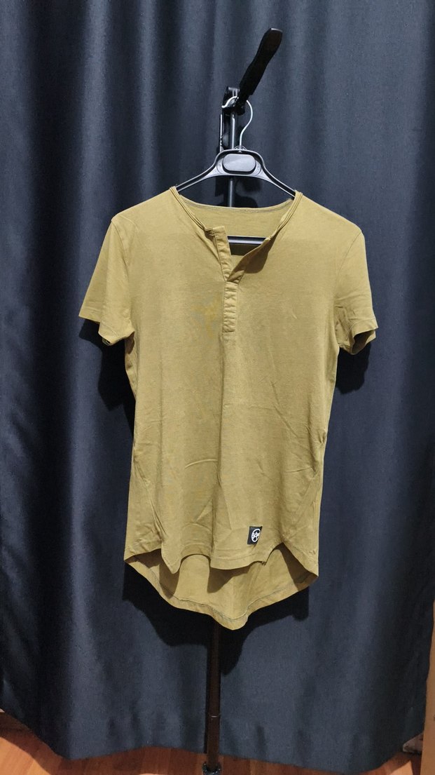 Bej renkli erkek keten kısa kollu tişört, düğmeli yakası ve salaş kesimiyle rahat bir görünüm sunar. Normal boy ve koyu bej tonu günlük kullanıma uygundur.