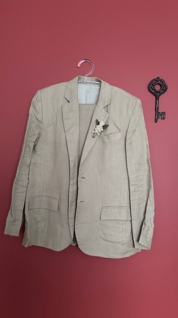 Bej Erkek Keten nakışlı özel dikim takım