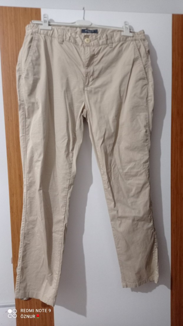 Bej renkli, keten kumaştan yapılmış, normal boy ve rahat kesim erkek pantolon. Desensiz, gündelik kullanıma uygun normcore tarzında.