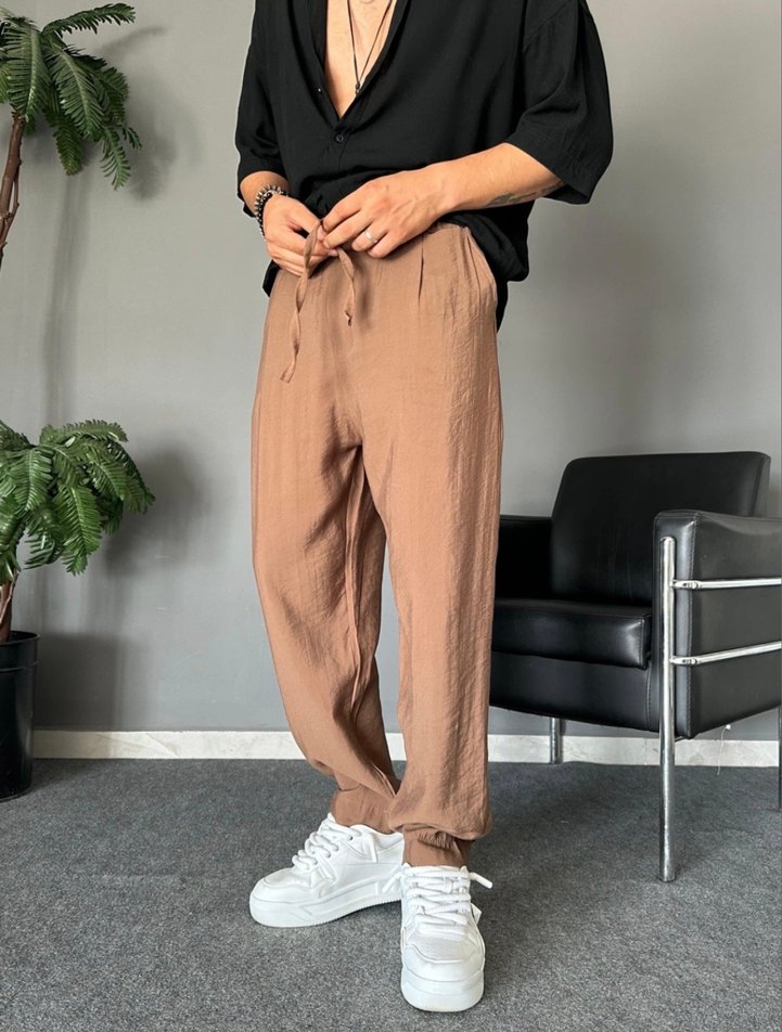 Bej renkli, keten kumaştan yapılmış, rahat kesim midi uzunluğunda, desen içermeyen erkek pantolonu. Sokak stiline uygun, zahmetsiz şıklık sunar. MATCHİNG MARKA PANTOLON Kremir rengi die geçiyor SON FİAT