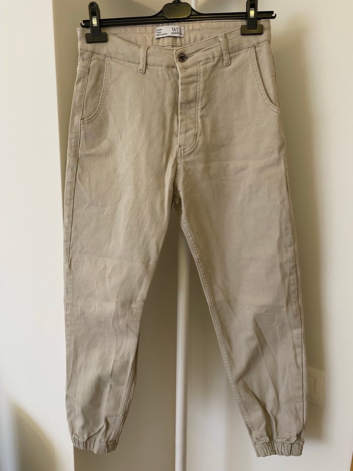 Bej renkli erkek keten pantolon, rahat kesim ve normal boyda. Günlük kullanım için rahat ve şık, sokak stiline uygun.