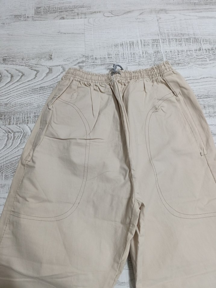 Bej renkli keten kumaştan, bol kesim ve elastik bel detaylı, günlük rahat kullanıma uygun kısa pantolon.