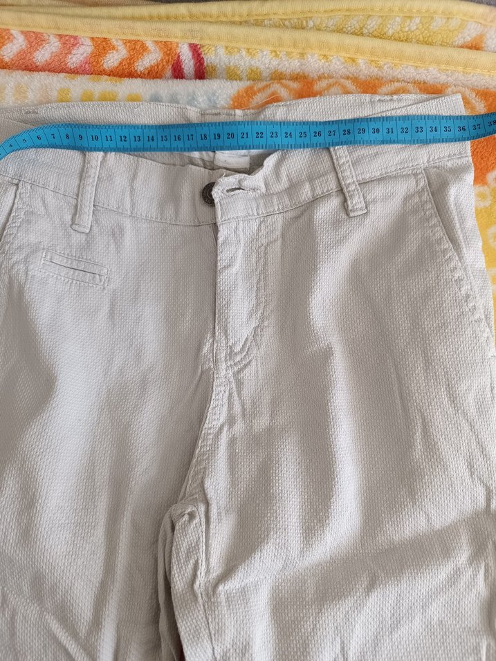 Bej keten kumaştan, düğmeli ve rahat kesim erkek pantolon. Normal boyda, desen içermeyen, günlük dış mekan kullanımı için uygun.