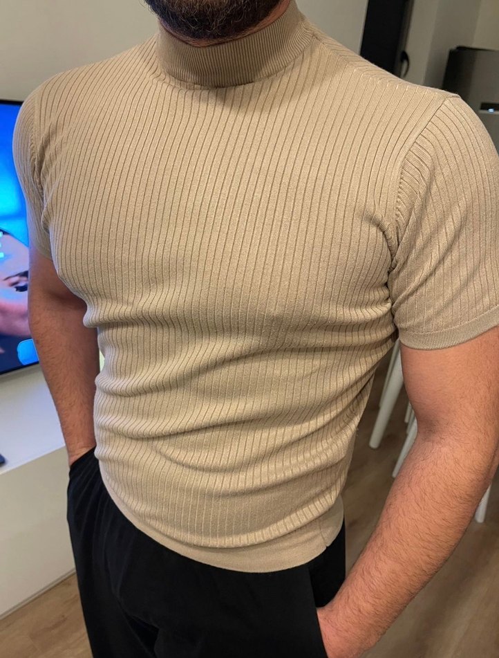 Bej renkli, kısa kollu ve balıkçı yaka, fit kesim erkek tişörtü. Yumuşak sentetik kumaştan ve kabartmalı dokulu, günlük rahat stil için uygun.