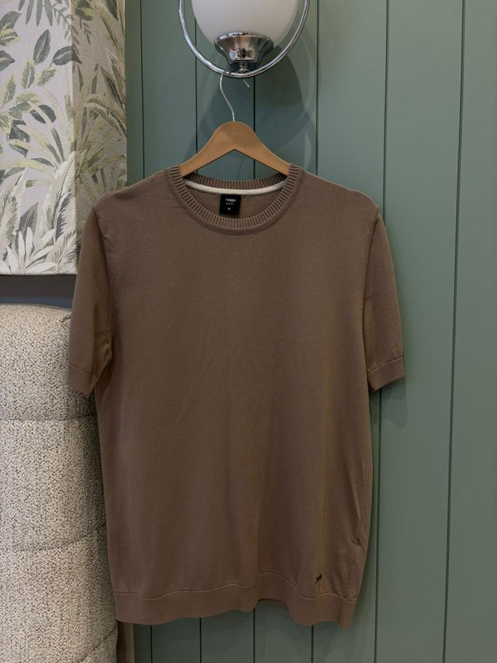 Bej renkte, yuvarlak yakalı ve kısa kollu erkek tişörtü. Pamuklu kumaştan, rahat ve bol kesim. Günlük kullanıma uygun sade ve şık bir tasarım.