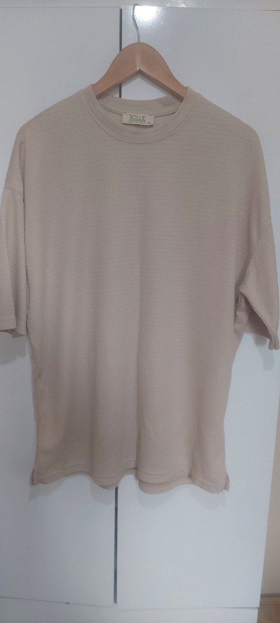 Bej renkli, kısa kollu, oversize kesim erkek tişörtü, yumuşak sentetik kumaştan, günlük rahat stil için uygun.