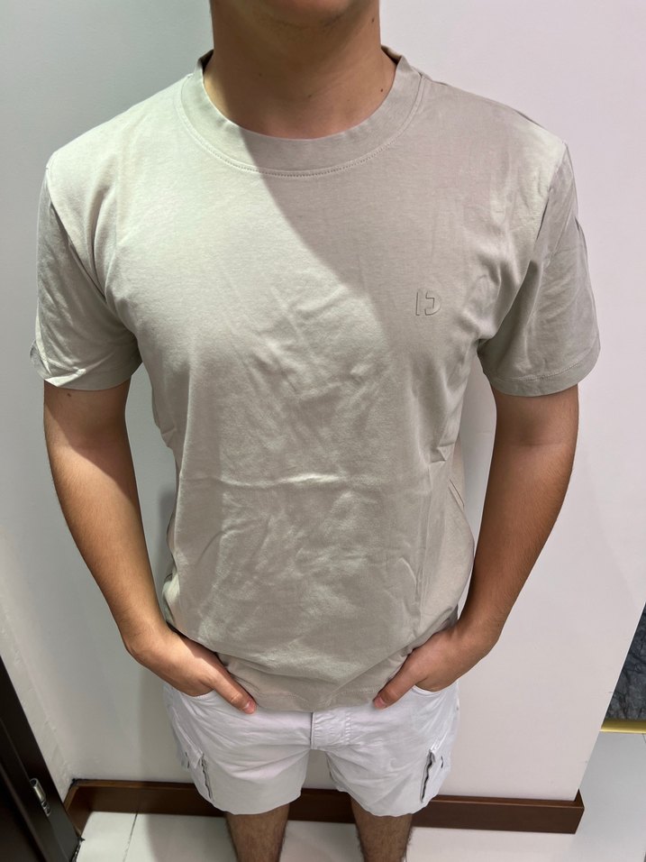 Bej renkli, kısa kollu, yuvarlak yakalı pamuklu erkek tişörtü. Rahat kesimi ve sade tasarımıyla günlük kullanım için uygundur.
