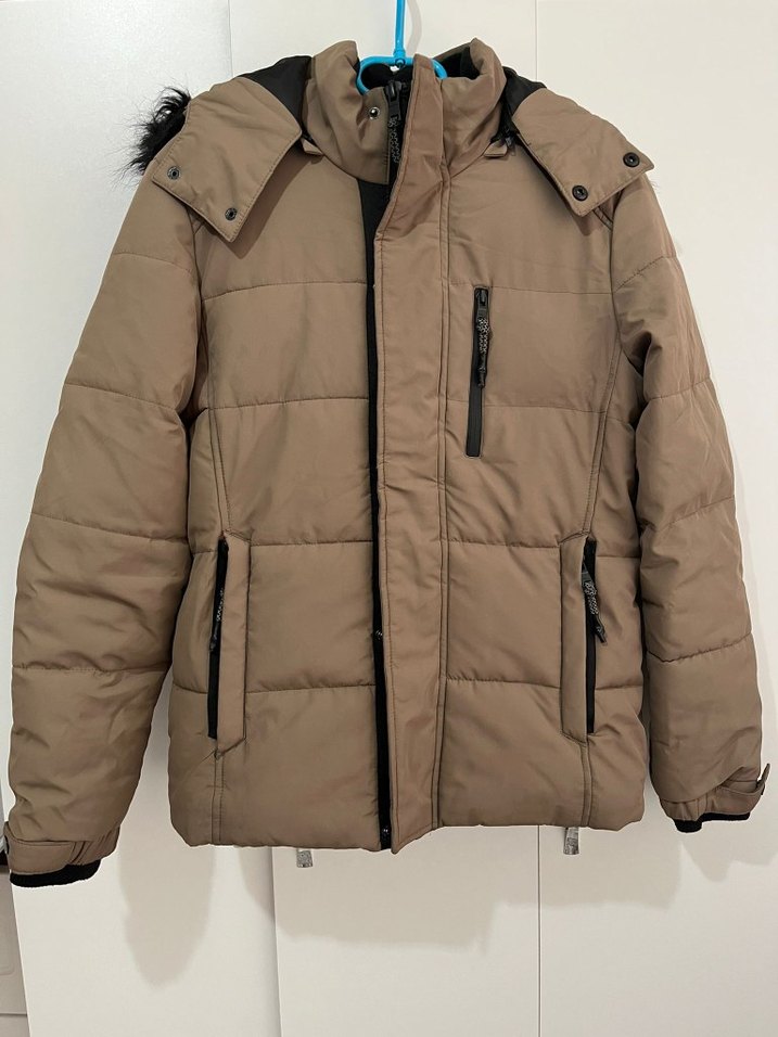 Bej renkli, kürk detaylı, uzun kollu ve yakası kesik detaylı, sentetik kumaştan yapılmış erkek kışlık mont. Rahat ve şık, sokak stili için ideal.