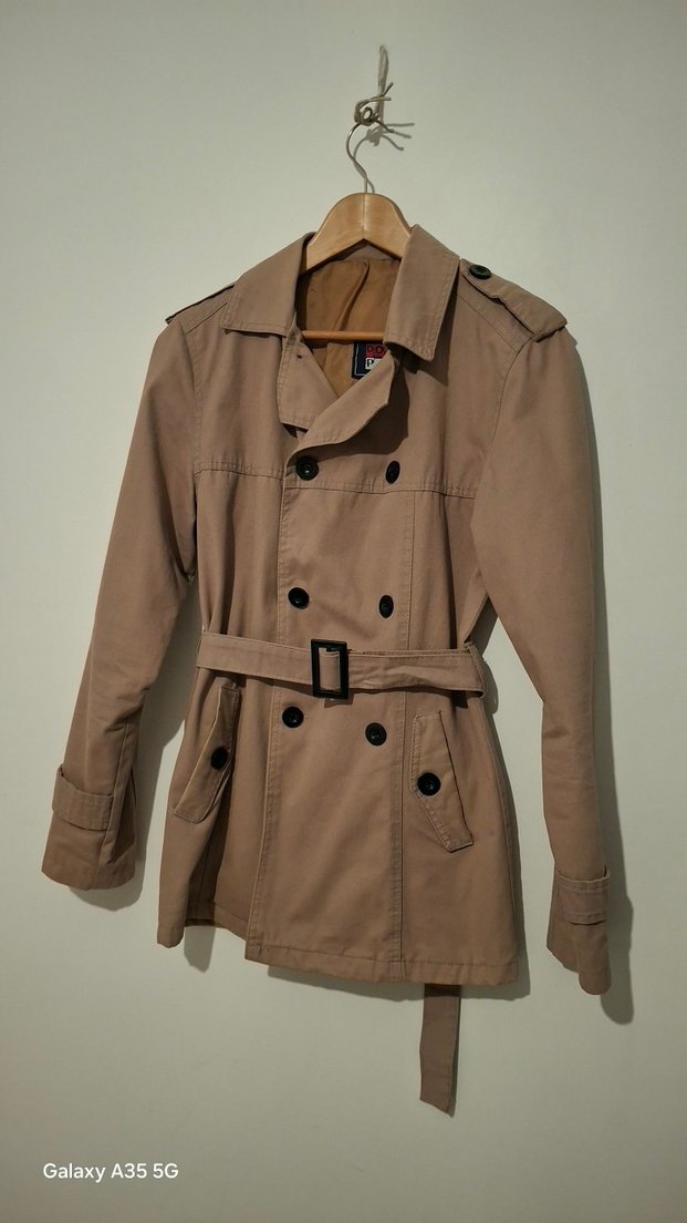 Bej renkli midi trençkot, kuşaklı ve fitted kesim. Yumuşak dokusu kumaştan, çift düğmeli uzun kollu, günlük şık sokak stili için uygun. tertemiz kullanıldı hiç bir sorunu yok