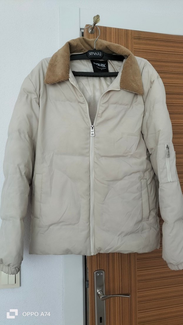 Bej renkli, fermuarlı erkek mont m beden yazıyor ancak geniş kalıp l xl birine daha iyi olur kolunda ufak takılma var