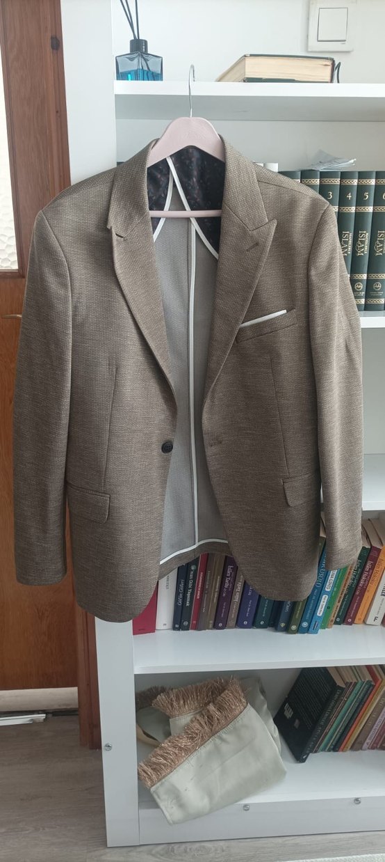 Bej renkli, düğmeli ve klasik kesim erkek takım elbise ceketi. Ofis kullanımı için uygun, uzun kollu ve modern tarzda.