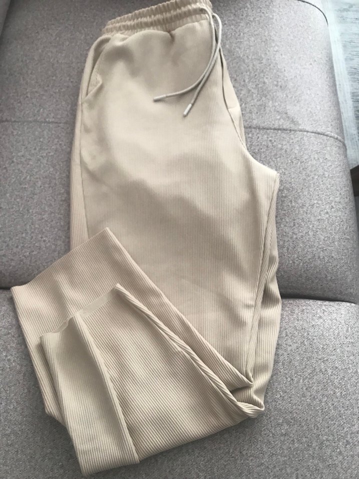 Bej renkte, pilili ve normal boyda kadın eşofman altı. Yumuşak sentetik kumaştan, rahat kesim ve günlük kullanıma uygun.