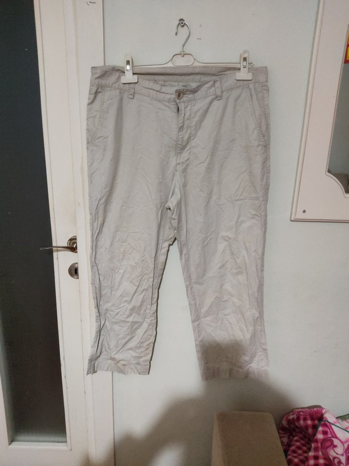 Bej keten kumaştan, bol kesim ve midi boyda, rahat ve şıiyi durumdak bir dış mekan pantolonu.