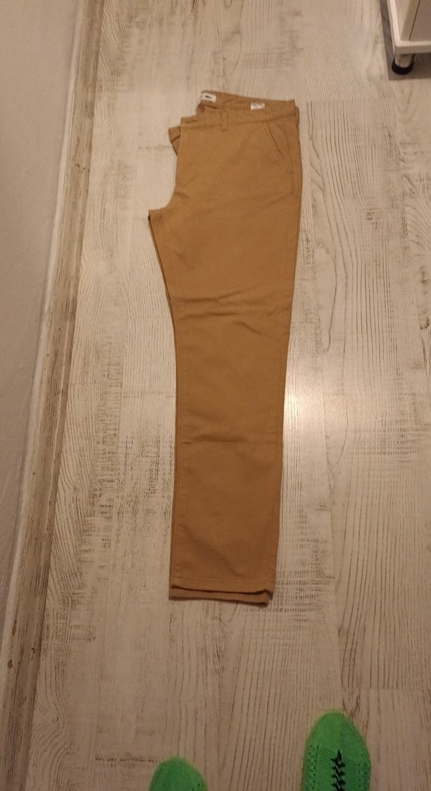 Bej renkte, parlak sentetik kumaştan üretilmiş, normal kesim ve boyda erkek pantolon. Desensiz yapısıyla günlük kullanıma uygundur.