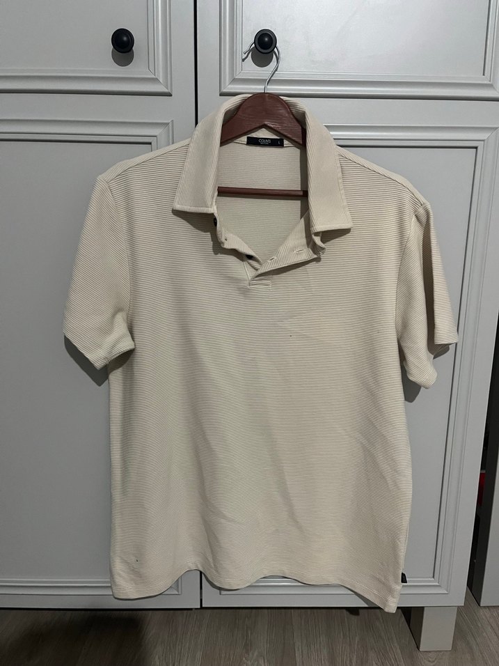 Bej erkek polo tişört, yakalı ve kısa kolludur. Gevşek kesimi ve normal boyu ile rahat ve günlük kullanıma uygundur.