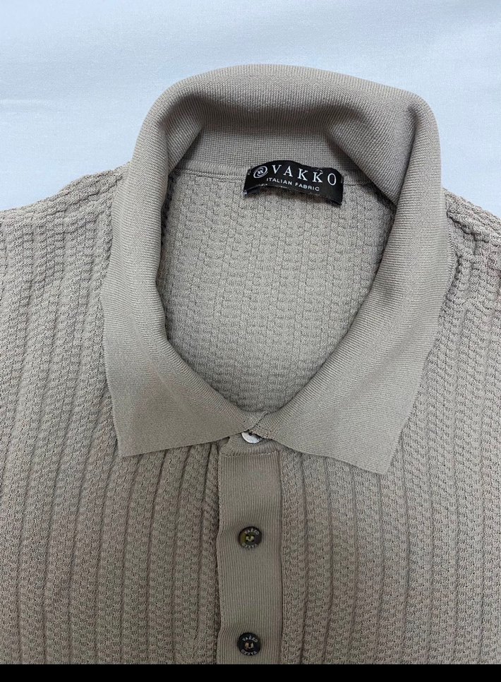 Bej renkli düğmeli yaka, kısa kollu erkek polo tişört. Triko kumaştan, rahat kesim ve günlük sokak giyimine uygun.orjinal vakfı hiç giyilmedi