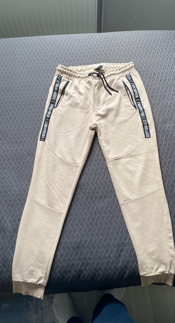 Bej renkli, bol kesim erkek çocuk eşofmanı. Yumuşak sentetik kumaştan, fermuarlı cepler ve bağcıklı bel detayı ile rahat kullanım sağlar.