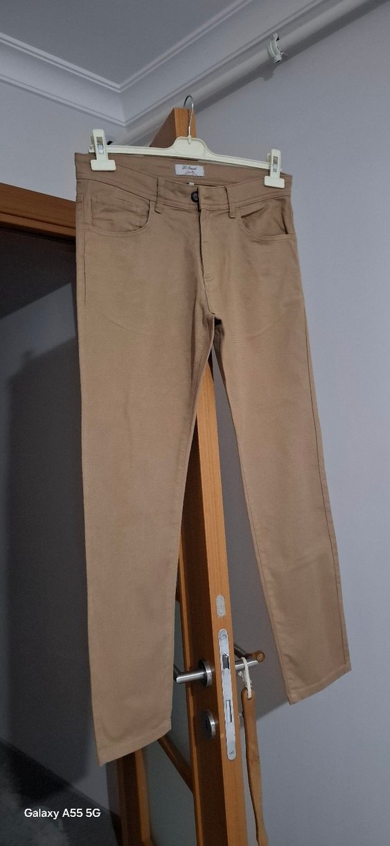Bej renkli, rahat kesim ve normal boyda erkek pantolonu. Pürüzsüz sentetik kumaştan üretilmiştir. Desensiz tasarımı günlük sokak stiline uygundur, zahmetsiz şıklık sunar.