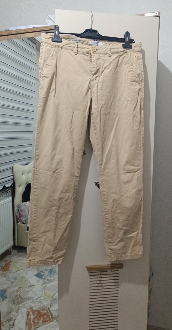Bej renk, regular fit kesim ve normal boyda olan bu erkek pantolon, yumuşak sentetik kumaştan üretilmiştir. Desensiz sade tasarımıyla günlük ve şık sokak stiline uygundur. boy 96, bel 41 , paça 17.5 paçasında ufak kusuru var son fotoya bakiniz