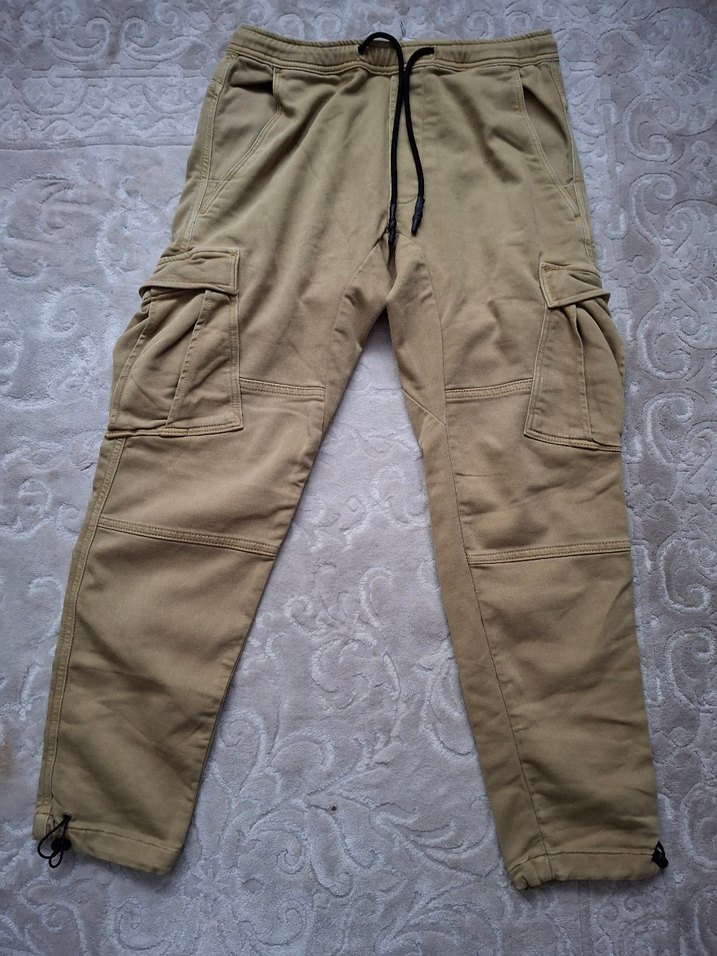 Bej renkli, kemerli, bol kesim erkek pantolon, yan cepli, sentetik kumaştan günlük rahat kullanım için uygun. ️İyi durumda, biraz giyilmiş üstte güzel duruyor