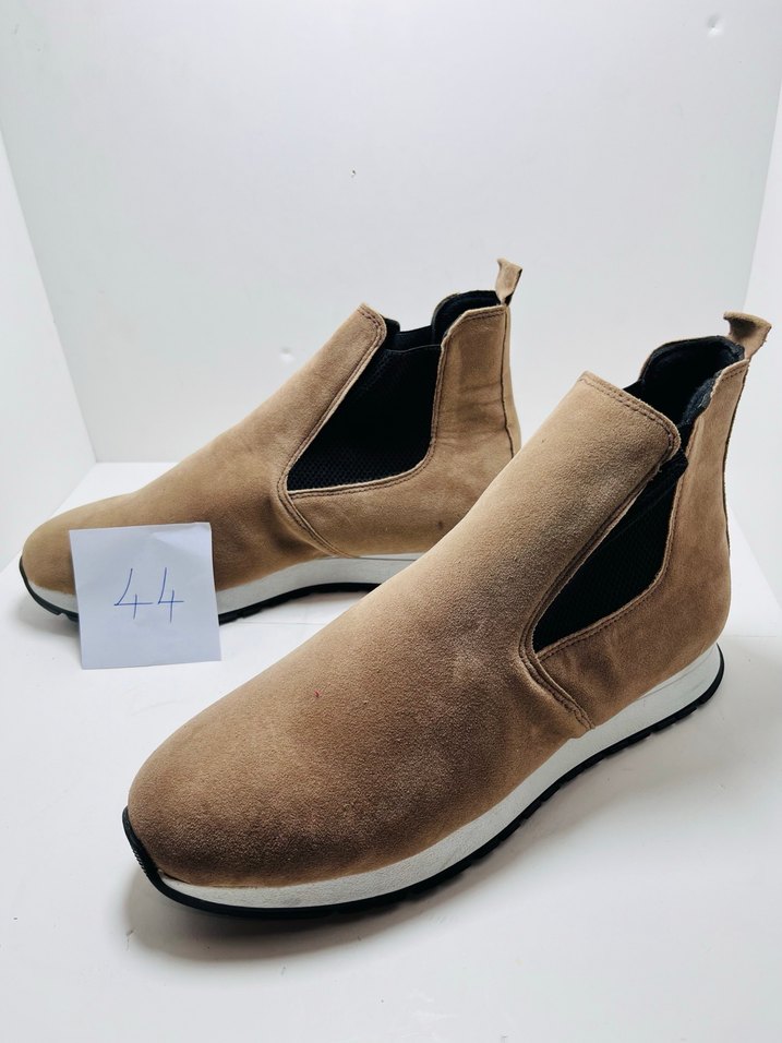Bej renkte, desen içermeyen erkek botları. Sokak modası tarzında, rahat athleisure etkisi ve gri taban detayına sahip şık tasarım.