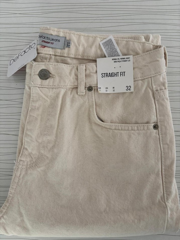 Bej, 32 beden, DeFacto marka Straight fit erkek kot pantolon krem-bej renktedir hiç giyilmemiştir hatası yoktur. Ürün etiketli olup sıfırdır.