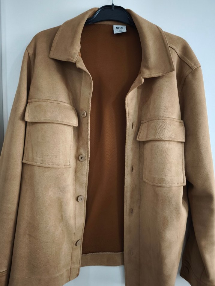 Bej süet malzemeden, düğmeli, notched lapel yakalı erkek ceketi. Uzun kollu, midi boy ve regular fit kesim, günlük rahat kullanıma uygun.