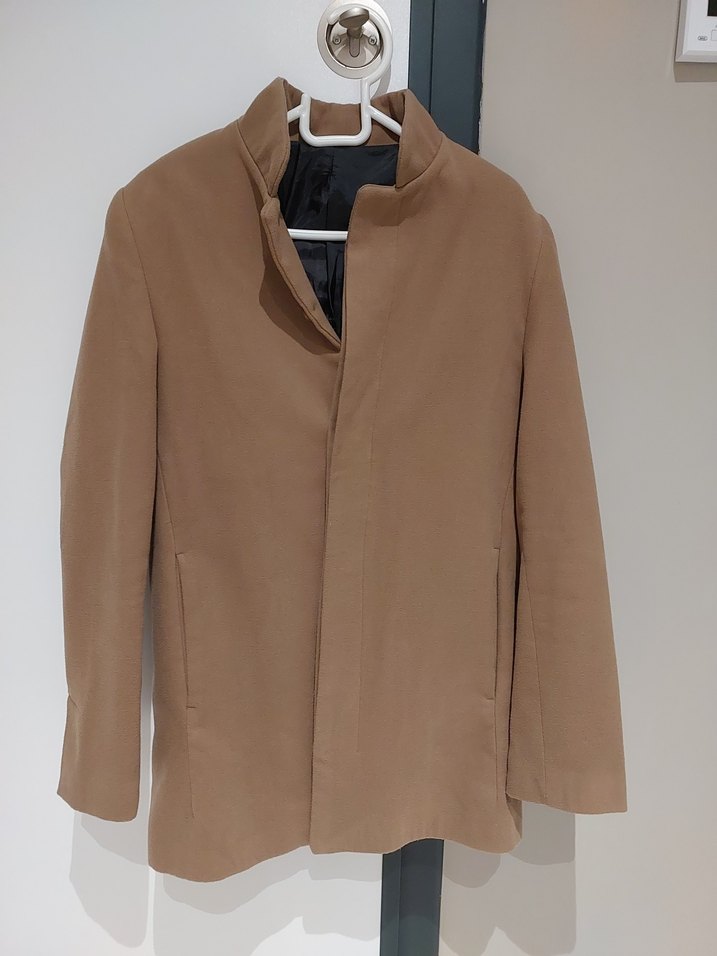 Bej renkli, süet kumaştan yapılmış erkek kaban, düğmeli ve normal kesimdir. Midi boyda, uzun kollu ve minimal sokak stili ile günlük kullanıma uygundur.