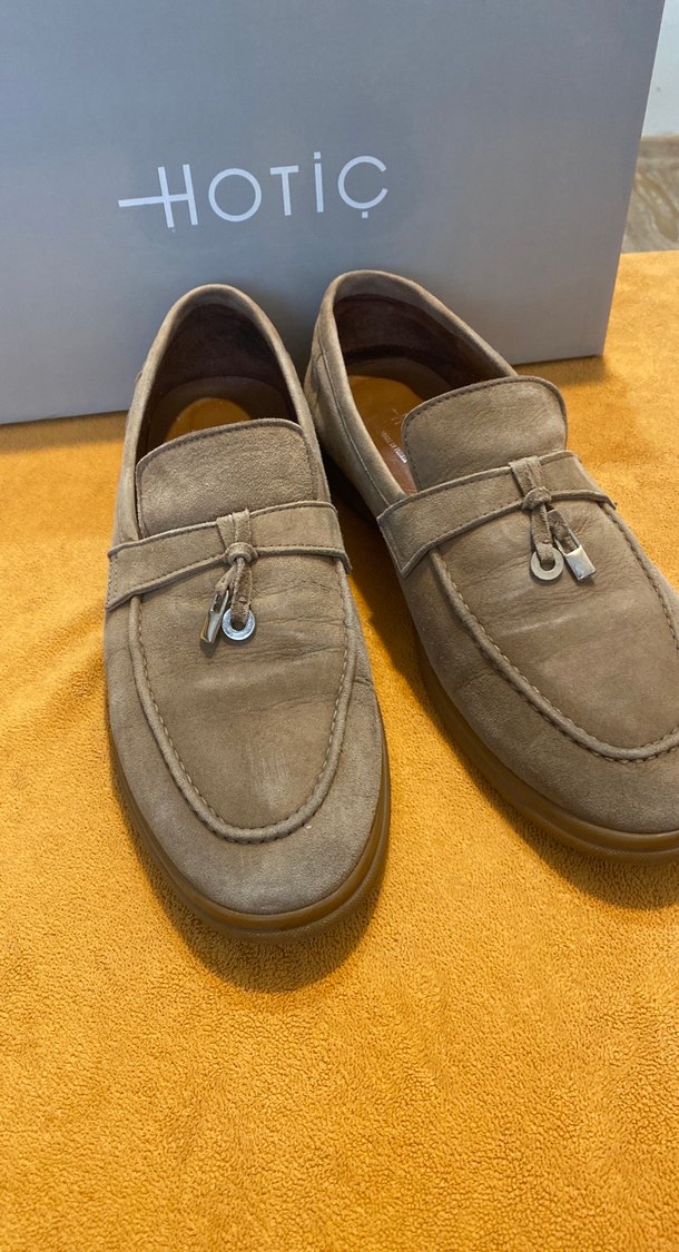 Bej renkte, süet malzemeden yapılmış, tokalı ve blok topuklu kadın loafer ayakkabılar. Marka: HOTIC.