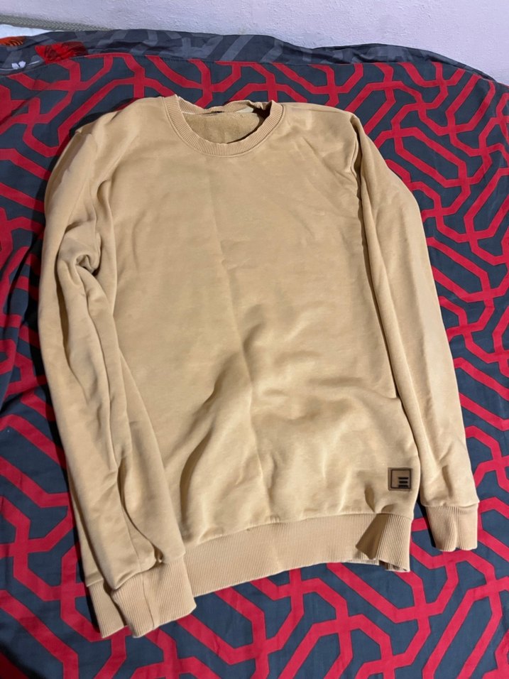 Bej renkli, uzun kollu ve yuvarlak yakalı erkek sweatshirtü, rahat kesimi ve yumuşak dokusuyla günlük kullanıma uygundur.