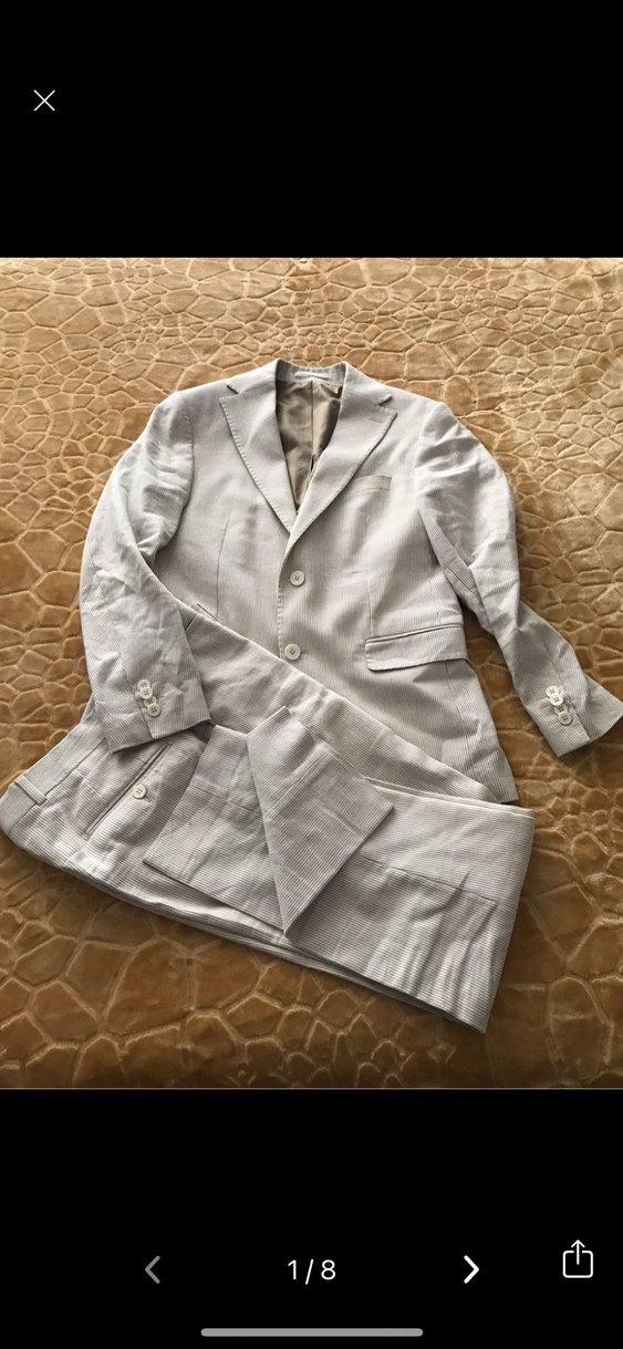 Bej renkte, regular fit, düğmeli, uzun kollu erkek takım elbisesi. Ofis kullanımı için klasik ve desensiz tasarıma sahip.